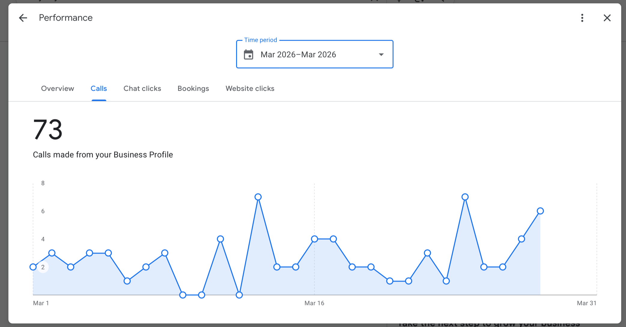 Google Business Profile call performance for March 2026 showing 73 calls with daily activity throughout the month