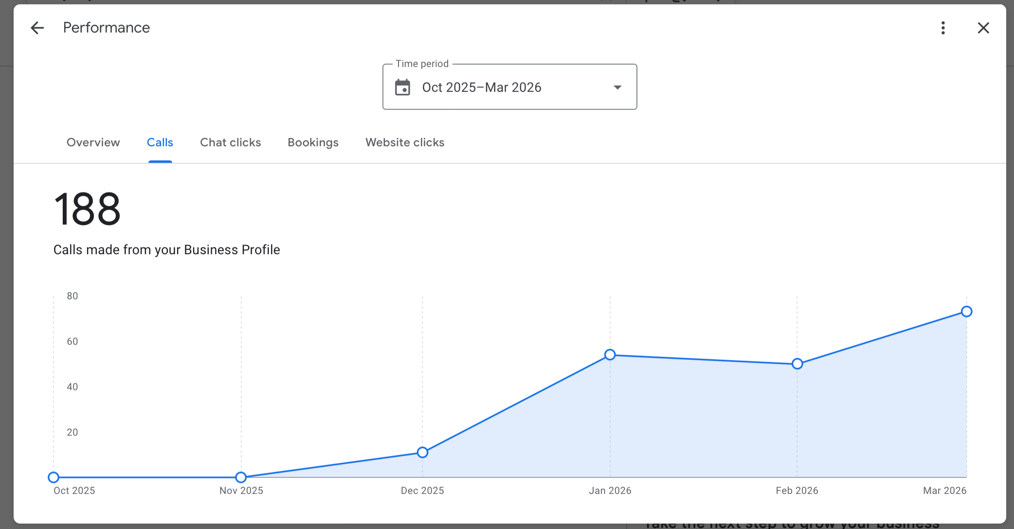 Google Business Profile performance showing 188 calls from November 2025 to March 2026 with consistent monthly growth