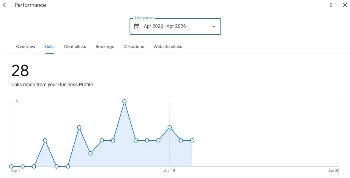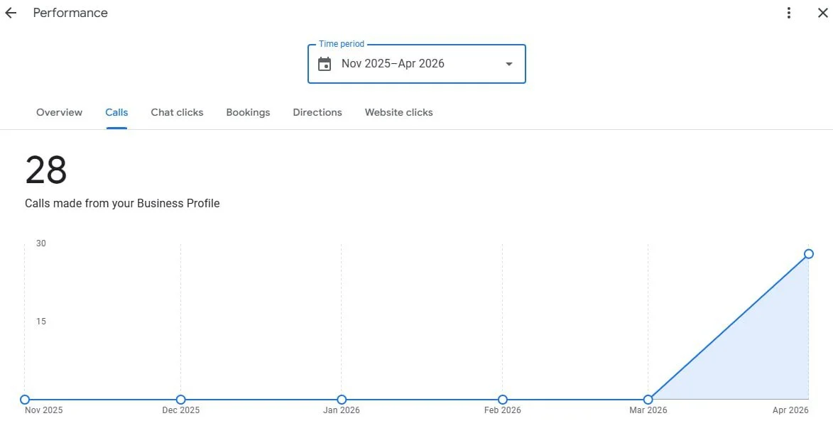 Once the Google Business Profile was verified with a physical location, calls from Google Maps started right away. By April 2026 — 28 calls in one month, organically.